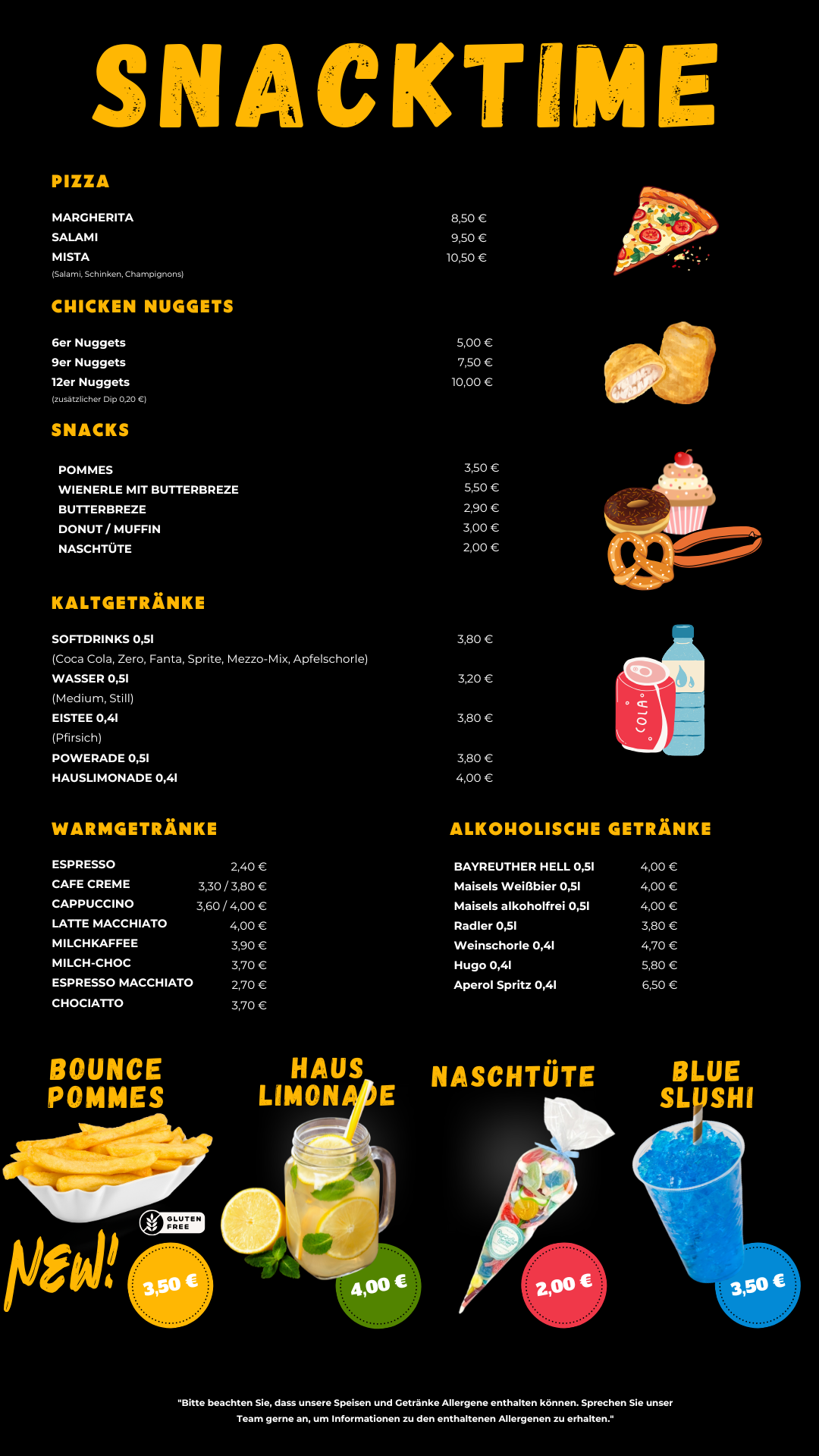 Nach all dem Spielen und Toben ist es Zeit für eine wohlverdiente Pause. Unser gastronomischer Bereich bietet ca. 100 Sitzplätze, damit Sie sich entspannt zurücklehnen können. Von köstlicher Pizza und leckerem Laugengebäck bis hin zu erfrischenden Snacks hier ist für jeden Geschmack etwas dabei. Für die süße Erfrischung gibt es leckeres Eis sowie Becher mit süßen Leckereien, die Ihnen neue Kraft verleihen, um den Tag gestärkt fortzusetzen.